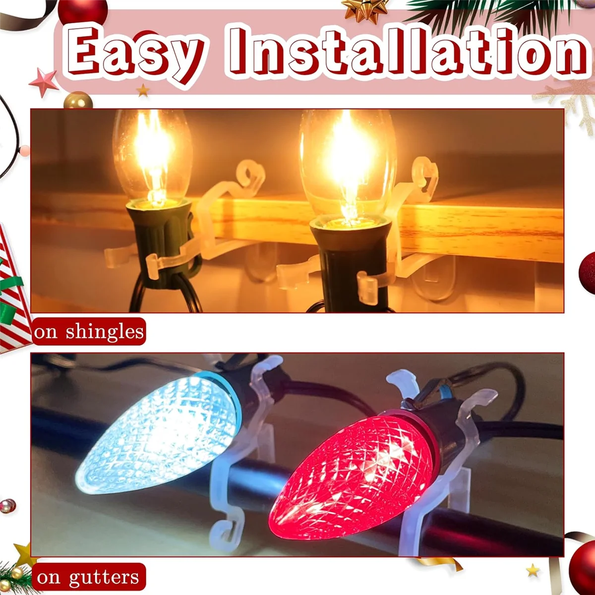 Designed for ease of use, C7 and C9 Christmas Light Gutter Clips make the process of hanging holiday lights simple and quick. The clips are engineered to fit snugly onto standard gutters and shingles without the need for nails, screws, or additional tools. Simply slide the clip over the edge of your gutter or shingle, and snap the bulb socket into place. The clips hold the lights securely without causing damage to your home, making them an ideal choice for renters, homeowners, and anyone looking to avoid permanent alterations to their property. With these clips, you can achieve a professional-looking light display with minimal effort.
