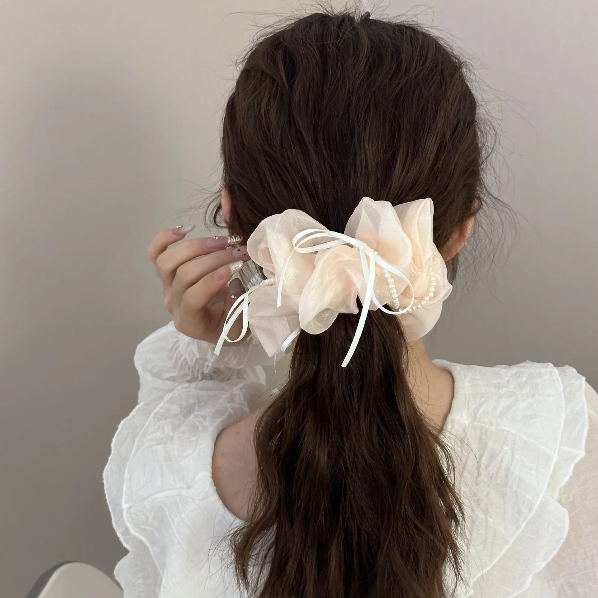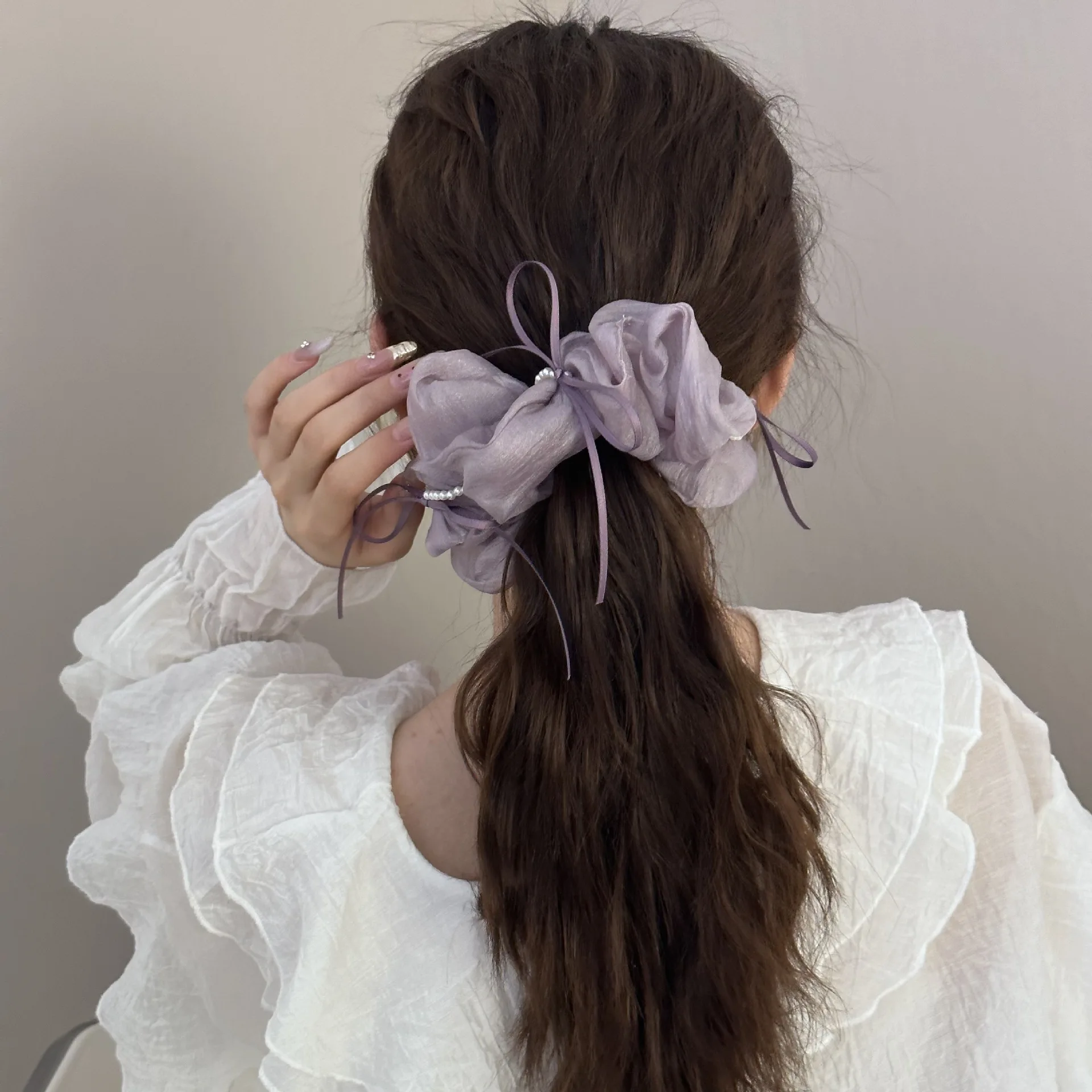 2. Secure with the Scrunchie: Wrap the Pony Scrunchie around your hair, adjusting the bow and pearls for the perfect look.