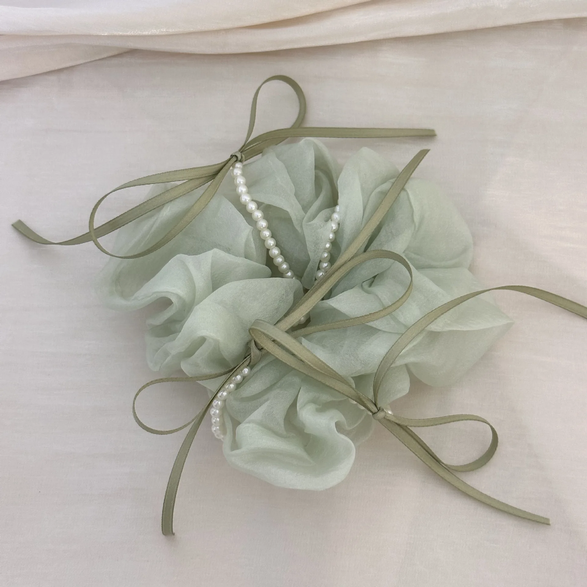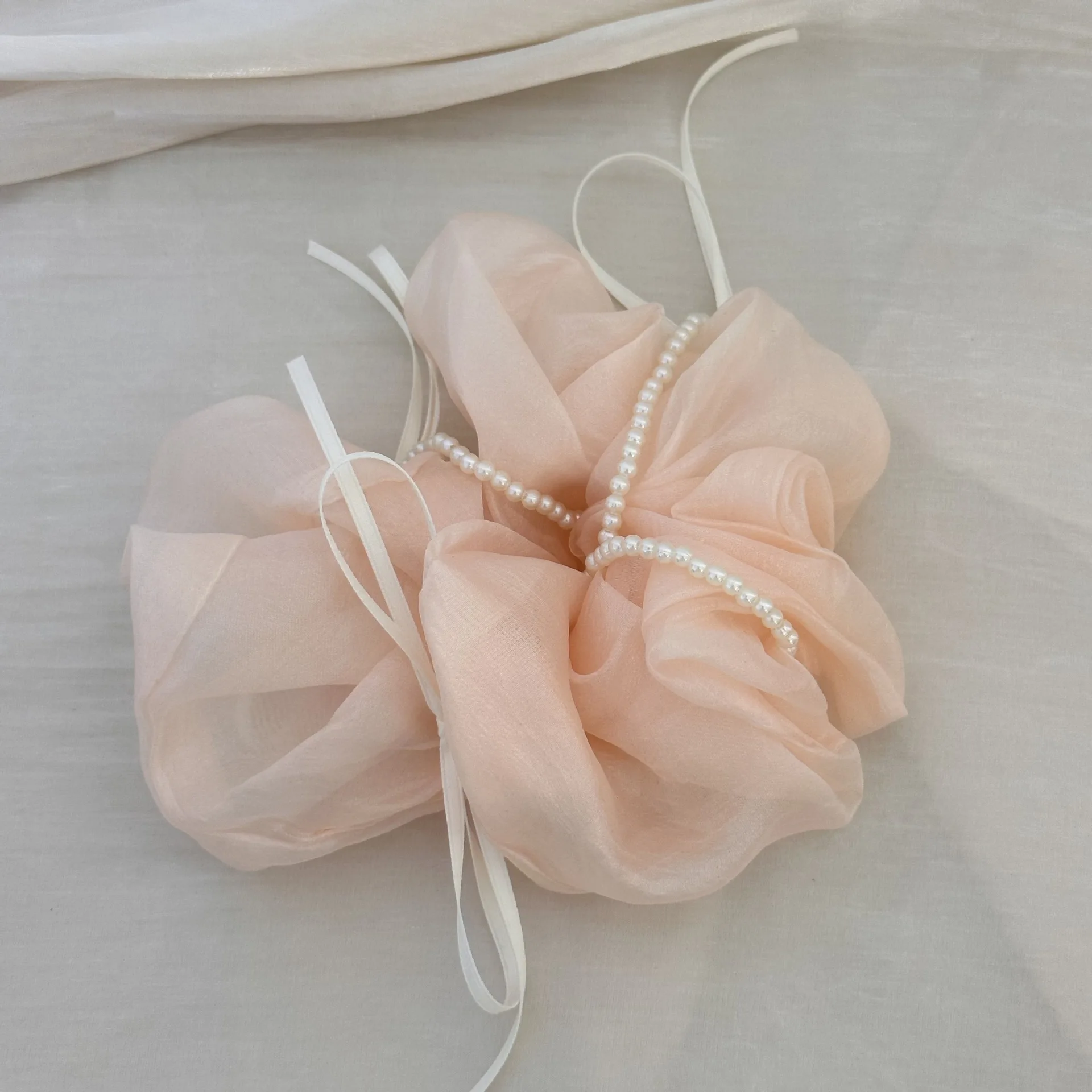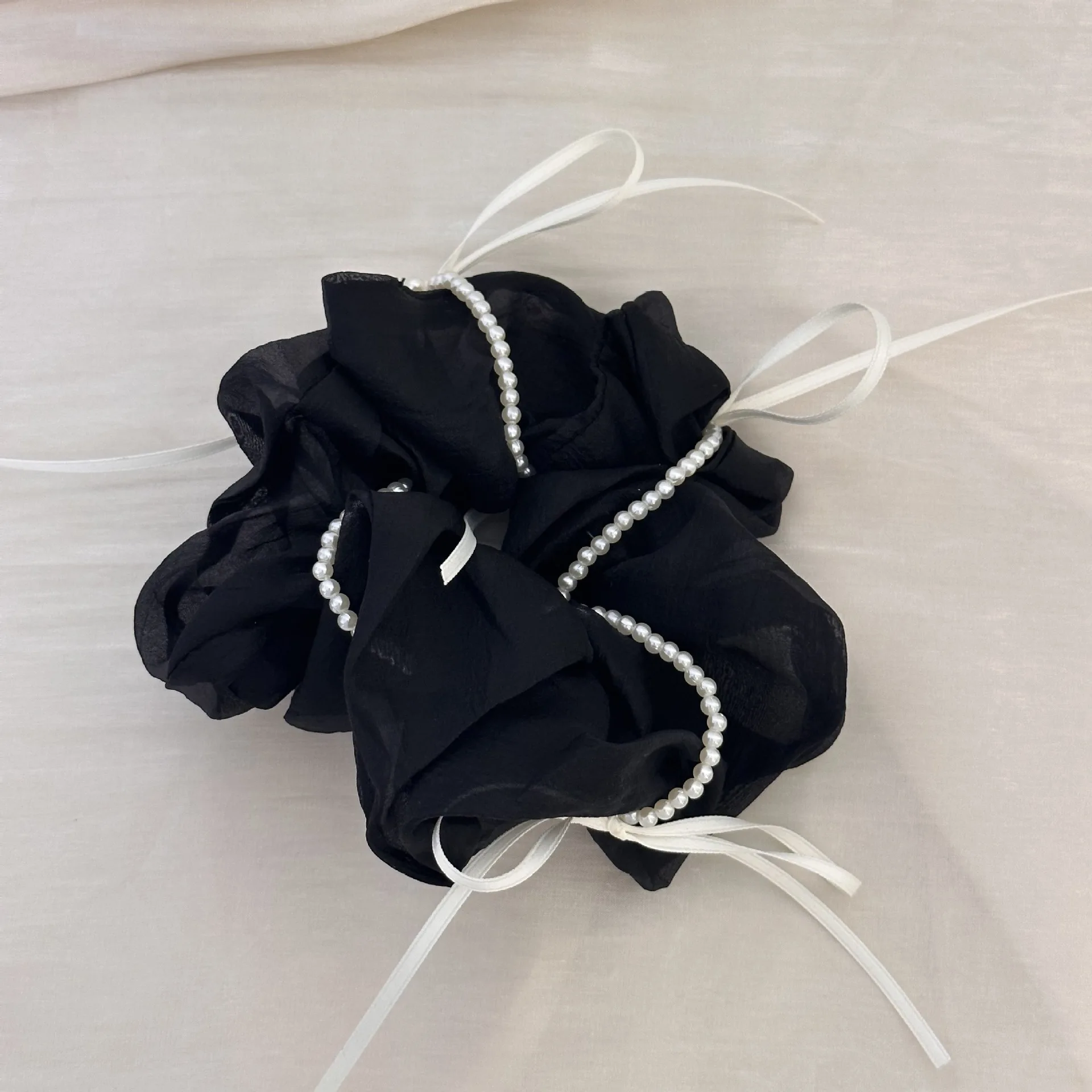 The delicate pearl embellishments elevate the design, giving the scrunchie a luxurious feel that enhances any outfit.