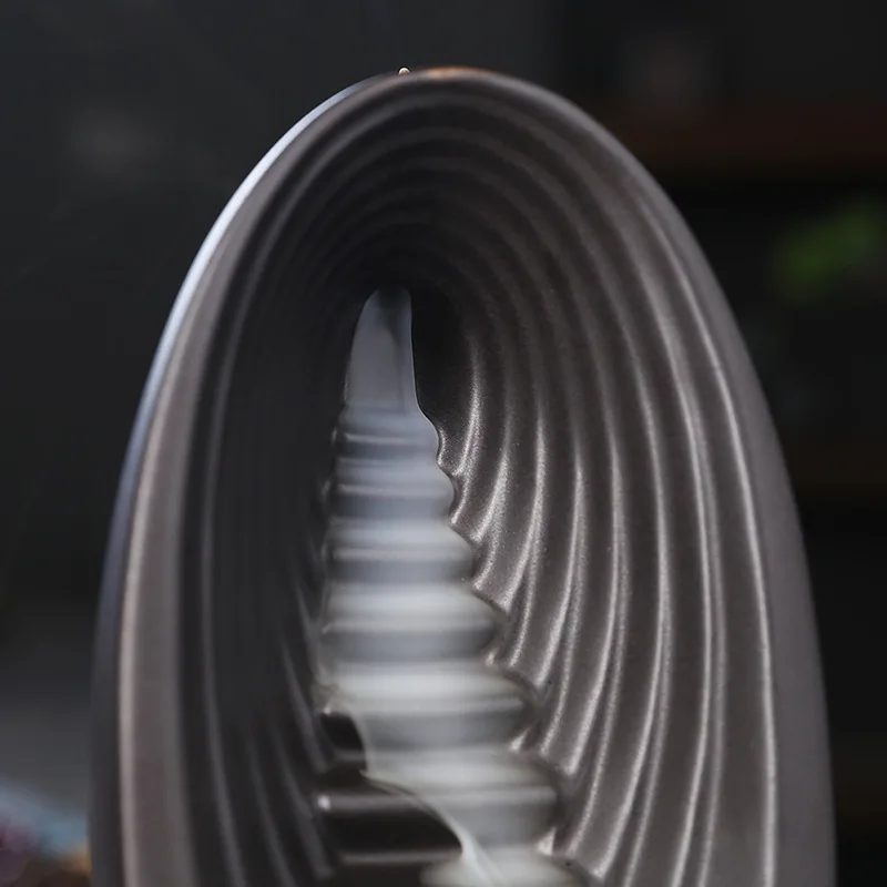 The backflow incense burner features a unique waterfall design that allows the smoke to flow downward, creating a calming and mesmerizing visual effect.