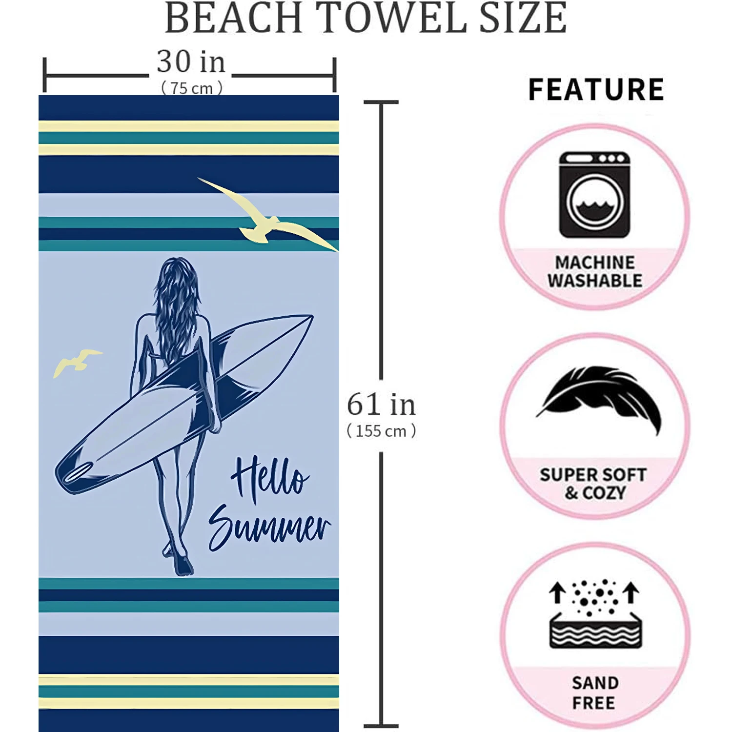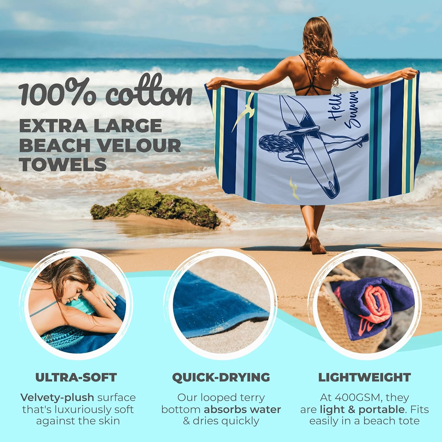 Vibrant Designs Featuring bold and vibrant designs inspired by the ocean and surf culture, these towels add a stylish touch to your beach gear. Stand out on the beach with eye-catching patterns and colors.